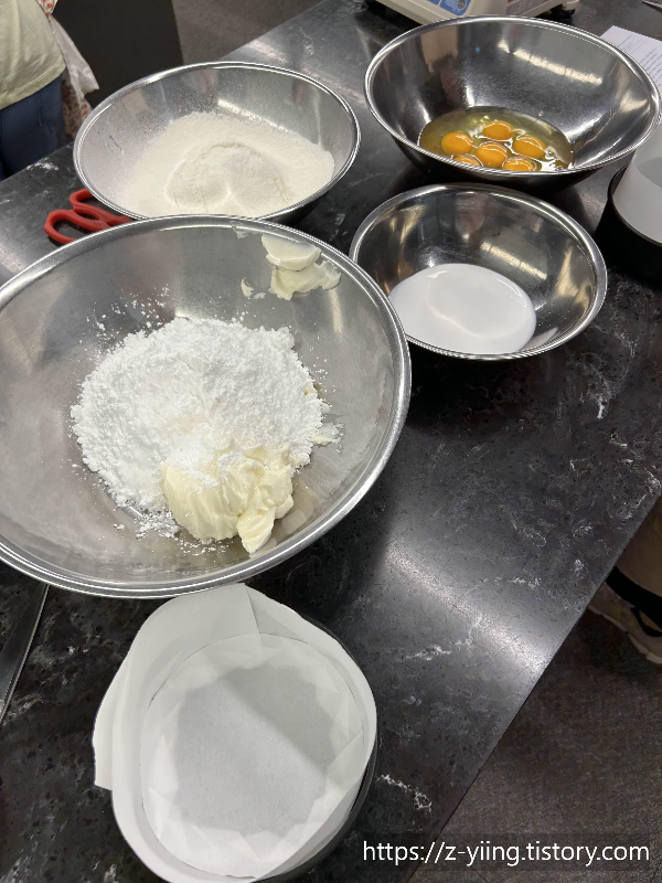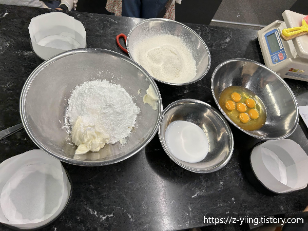 - 박력분+전분+베이킹파우더를 체질하여 주걱으로 혼합