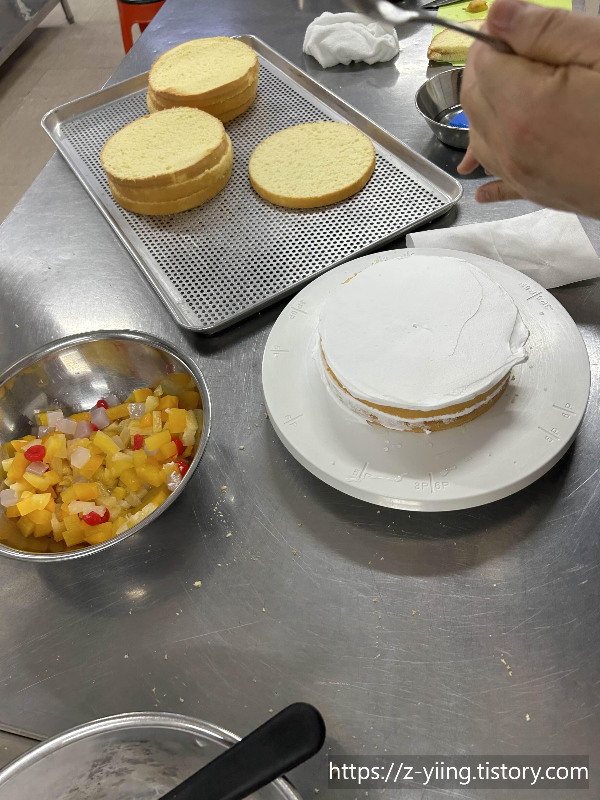 3단으로 잘라 나눠준 제누와즈는 층층이 쌓아 과일 케이크를 만들었다