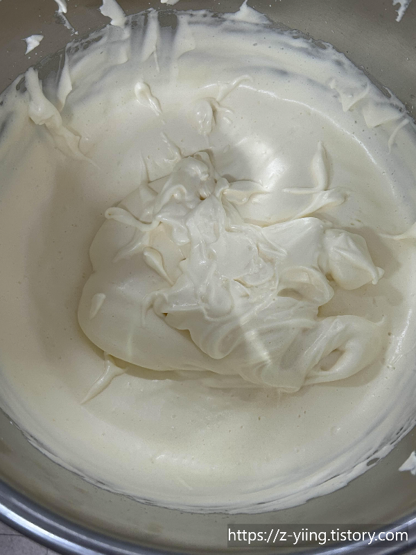 주걱을 들어올렸을 때 흘러내린 반죽이 1초정도 쌓이는 정도가 되어야한다