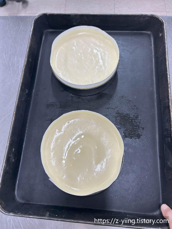 그 후 원형팬을 살짝 들어 바닥으로 떨어트려 탕! 쳐주어 기포를 제거하고 한바퀴 빙그르르 돌려준다