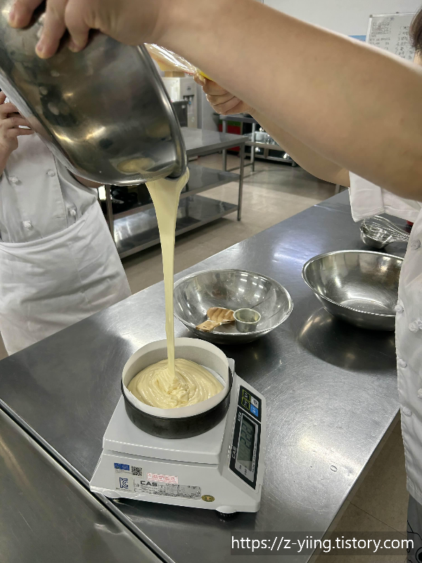 - 체친 박력분, 베이킹파우더, 바닐라향 주걱 혼합 → 중탕 물, 식용유 (60℃) 용기에 반죽 덜어(2주걱) 혼합 → 전체 반죽 가볍게(30초) 혼합 → 비중 0.4 ± 0.05