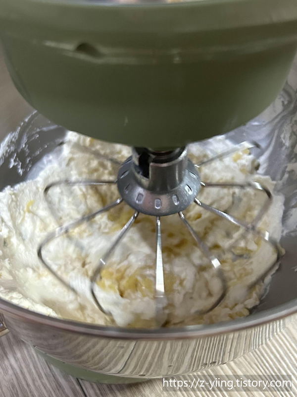 한김 식힌 반죽에 계란을 2-3회로 나눠 넣으며 섞어준다