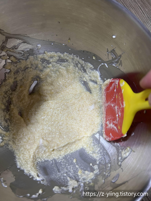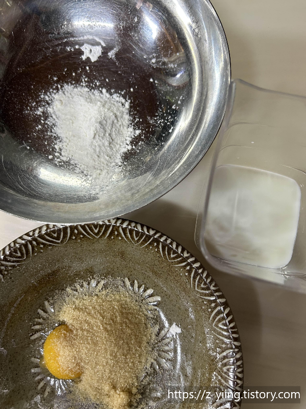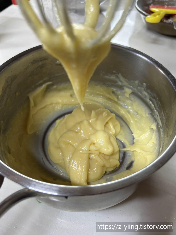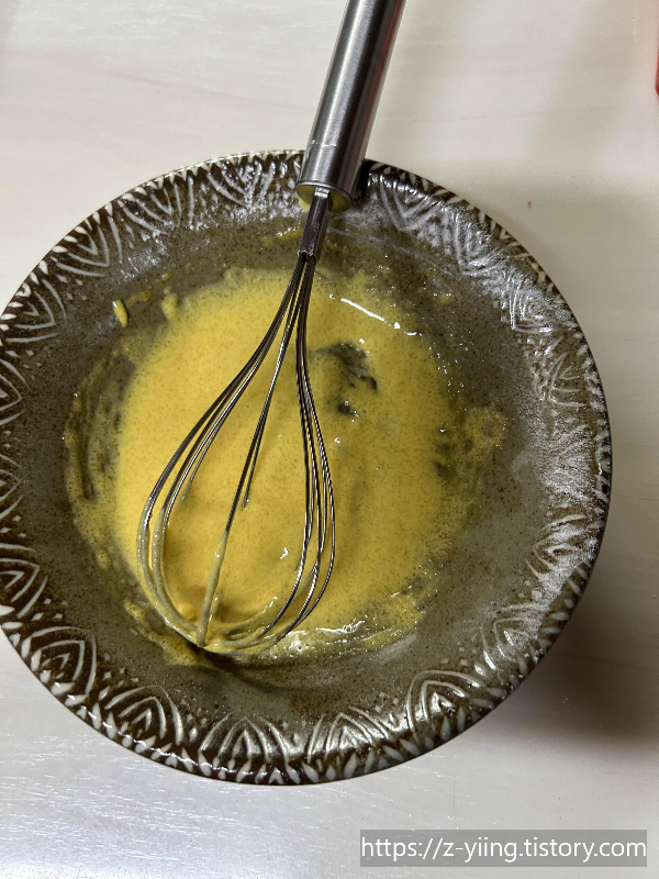 계란노른자 + 설탕 + 박력분 용기에 부어 섞어준다
