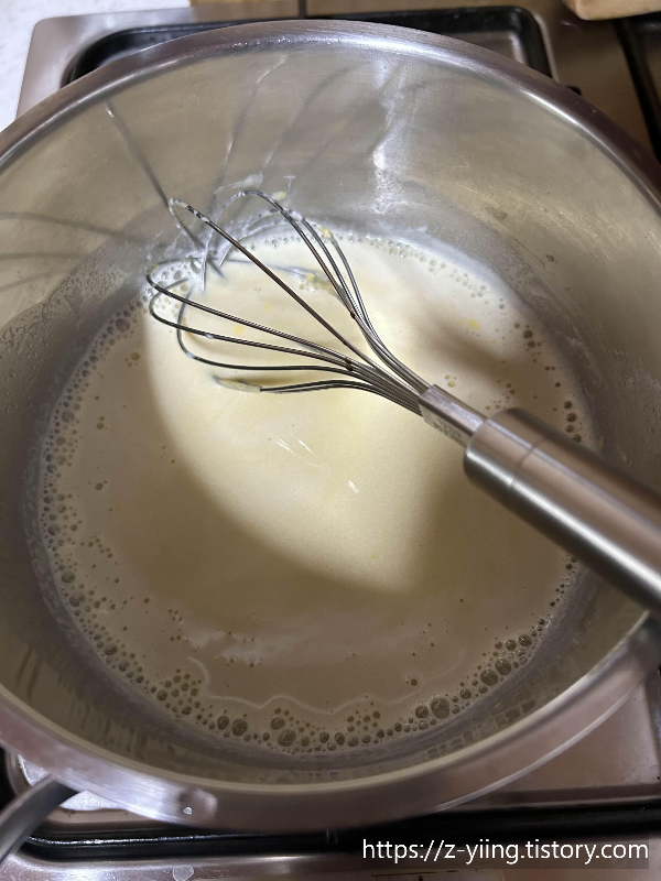 다시 냄비로 옮겨 가열하면서 거품기로 잘 저어준다