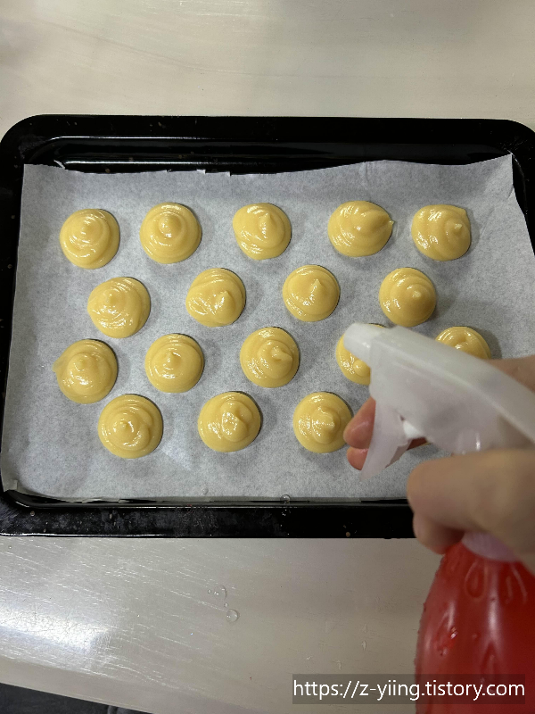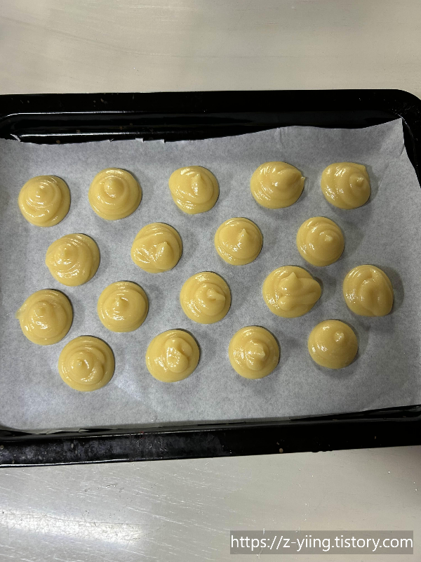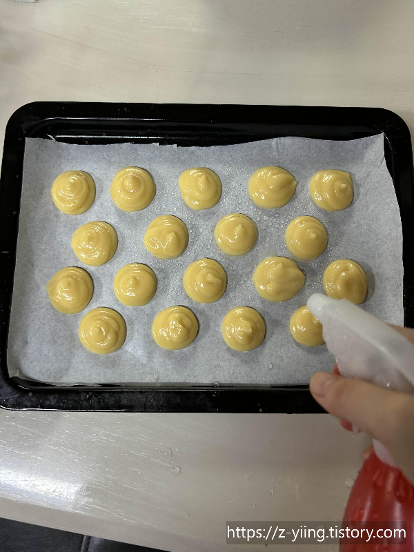 슈 반죽을 짤주머니에 담고 미리 체크해둔 자리에 반죽을 3cm크기로 반죽을 짜준다