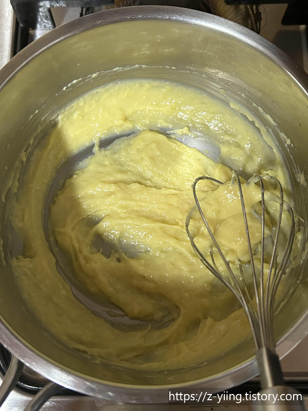슈 반죽을 오븐에서 굽는동안 슈 안에 넣어줄 크림을 만든다